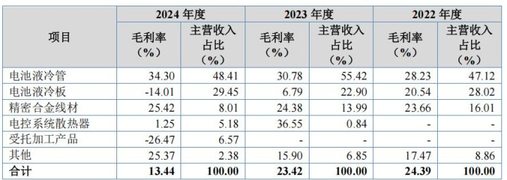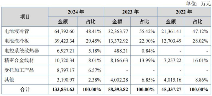 报告期内,新富科技的主营业务收入主要来源于销售电池液冷管(含受托加工产品)、电池液冷板、电控系统散热器等新能源汽车热管理产品,报告期内,公司新能源汽车热管理产品的销售占比分别为75.14%、79.16%、89.60%,呈增长趋势。