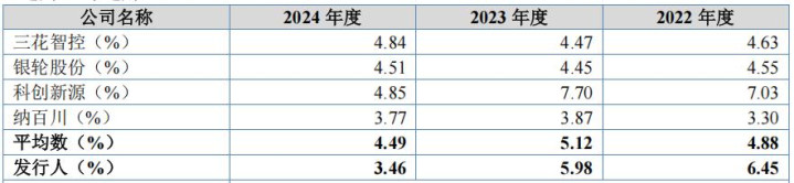 报告期内,新富科技研发费用率分别为6.45%、5.98%、3.46%,同行业可比公司研发费用率分别为4.88%、5.12%、4.49%。2022年和2023年,公司研发费用率略高于同行业可比公司均值,2024年公司研发费用占比低于可比同行均值。