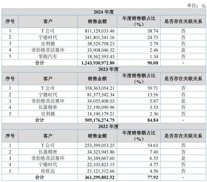 2022年、2023年和2024年,新富科技前五大客户销售收入分别为3.613亿元、5.092亿元和12.439亿元,占当期营业收入分别为77.92%、84.84%和90.08%,公司对前五大客户的销售额占当期收入比重较高。其中,报告期各期,公司对T公司销售收入占比超过50%,形成了对T公司的客户依赖。