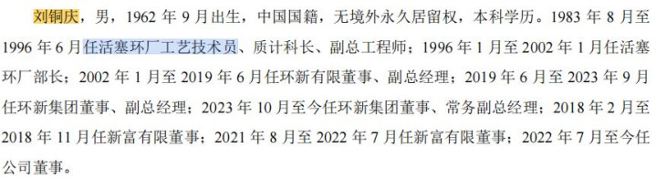 潘一新,男,1958年4月出生,中国国籍,硕士研究生学历。1982年9月至1989年1月任活塞环厂技术员、助理工程师、工程师;1989年1月至1989年8月任活塞环厂技改办主任;1989年8月至1991年4月任活塞环厂厂长助理兼技改办主任;1991年4月至1992年6月任活塞环厂副厂长;1992年6月至1997年3月任活塞环厂厂长、党委副书记、高级工程师;1997年3月至2002年1月任活塞环厂厂长、党委书记;2002年1月2019年6月任环新有限党委书记、董事长、总经理、总裁;2019年6月至今任环新集团董事长。