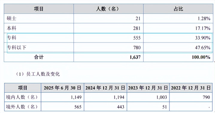 截至2024年末,新富科技员工学历专科及专科以下占比超8成。本科以上的仅有302人,占比为18.45%,其中研发人员为118人,占比仅6.88%,不足高新企业所要求的研发技术人员占比10%的标准。