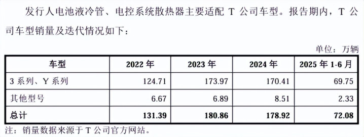 T公司系国际新能源汽车企业龙头,新能源汽车销量保持增长态势,公司系T公司重要供应商,双方合作关系稳定且发展前景广阔。一方面公司为T公司提供的产品种类不断增加,从最初的各类电池液冷管到目前开始批量供应电控系统散热器,均为T公司向公司采购的重要产品;另一方面,公司基于战略布局及加深与T公司的合作关系,已在墨西哥设立子公司,其产品主要供应给T公司北美工厂。
