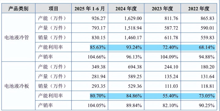 新富科技募投项目建成达产后,公司将新增264.00万件电池液冷管、367.20万件电池液冷板及267.60万件电控系统散热器的产能。而2025年1-6月,公司电池液冷管、电池液冷板的产能利用率分别为85.63%、80.70%,分别较2024年下降7.61%、4.16%。